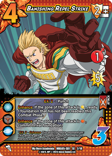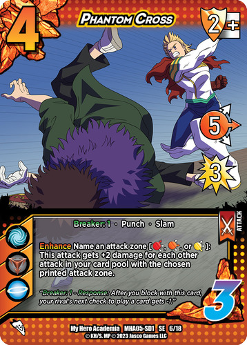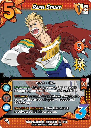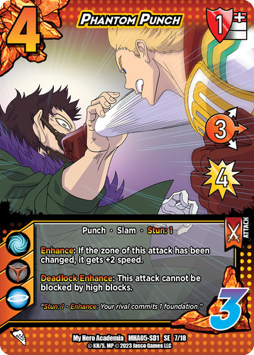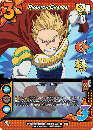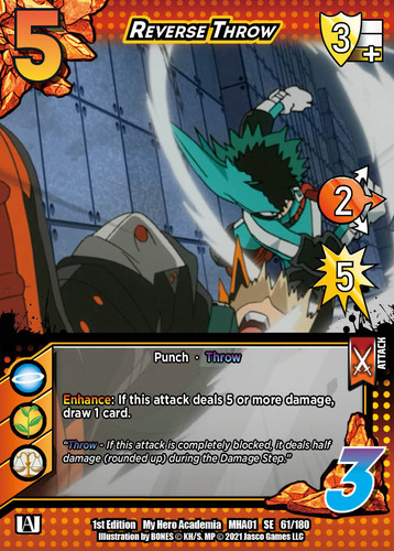 Mirio has FINALLY arrived on the tables and he’s clearly got his eyes set on carving out his own spot in the meta. His effect is simple and powerful, great for newer players to pilot when they grab a Rival Deck. His damage boost takes mid range attacks and makes them a need to block. Taking Sero‘s “Choose Your Zone” ability is also a clever way to add to his aggressive prowess because if you think your opponent doesn’t have a certain block zone in hand, everything is hitting that weak spot all of the sudden.
