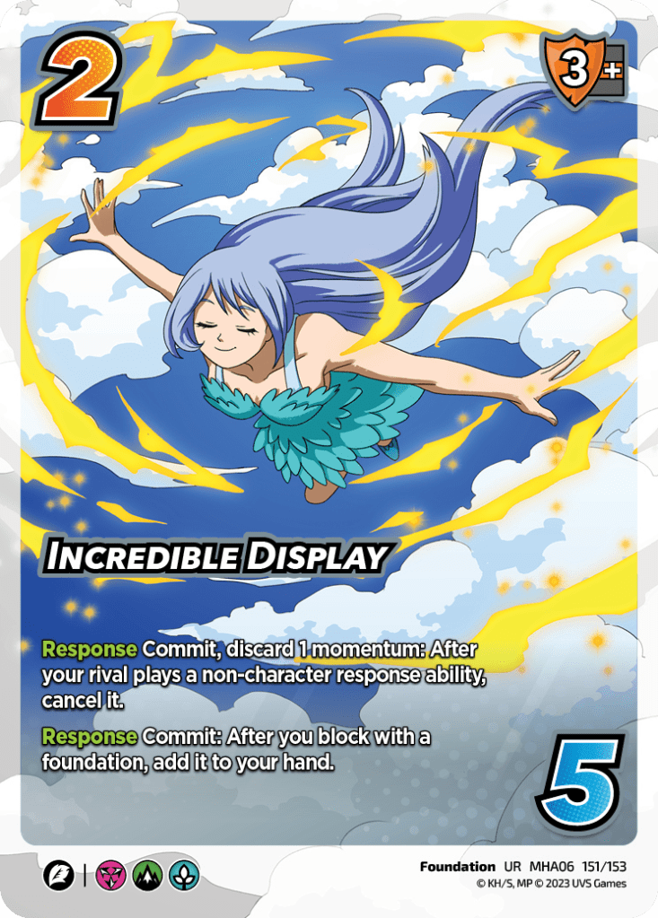 If Nejire doesn’t see play after this… smh… Incredible Display lives up to the name, allowing Hado and others to reuse blocks like Evade & Copy or Harden. Mix that in with a standing Response cancel, and the Life & Earth symbols gain even more control over the board and their defensive walls get even bigger. The block modifier does give me pause and with the cost for both effects being commits, you probably won’t be spamming this at a 4 of in any decks any time soon. However, the strength of this card is pretty clear. Expect to see this at the top tables!