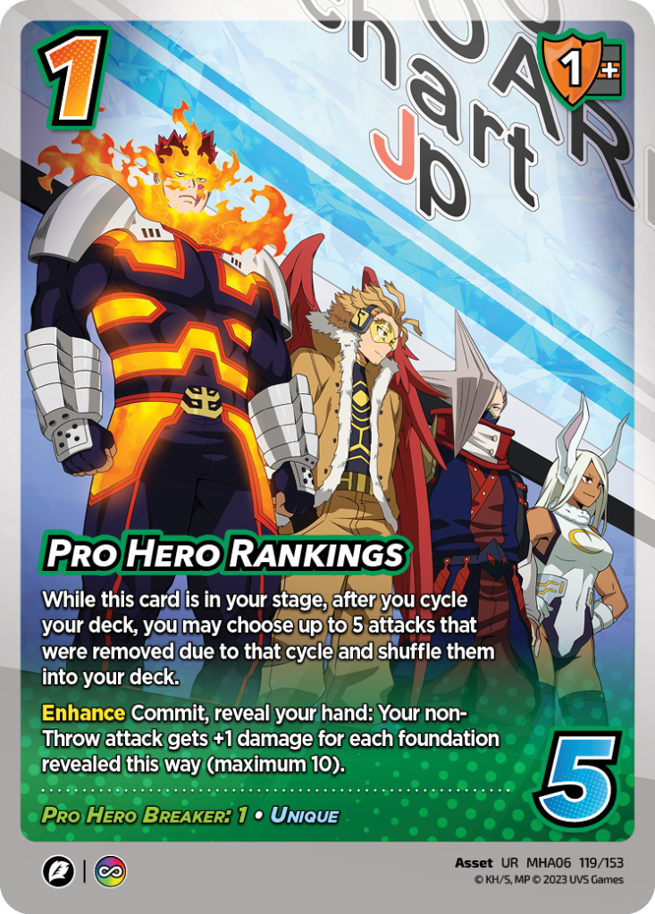 You know how every set has a card that people lose their mind over? They say it’s absolutely unfair for months and not that much comes of it? Enter: Pro Hero Rankings. Now, I haven’t heard anyone clamoring for this asset quite yet, but it fits the bill. The effect to add a few points of damage to your attack is pretty strong, especially if you run a Character like All Might 3 or Rock Lock, who can add cards in afterward that your rival doesn’t have knowledge of. Breaker 1 is pretty nice as well.