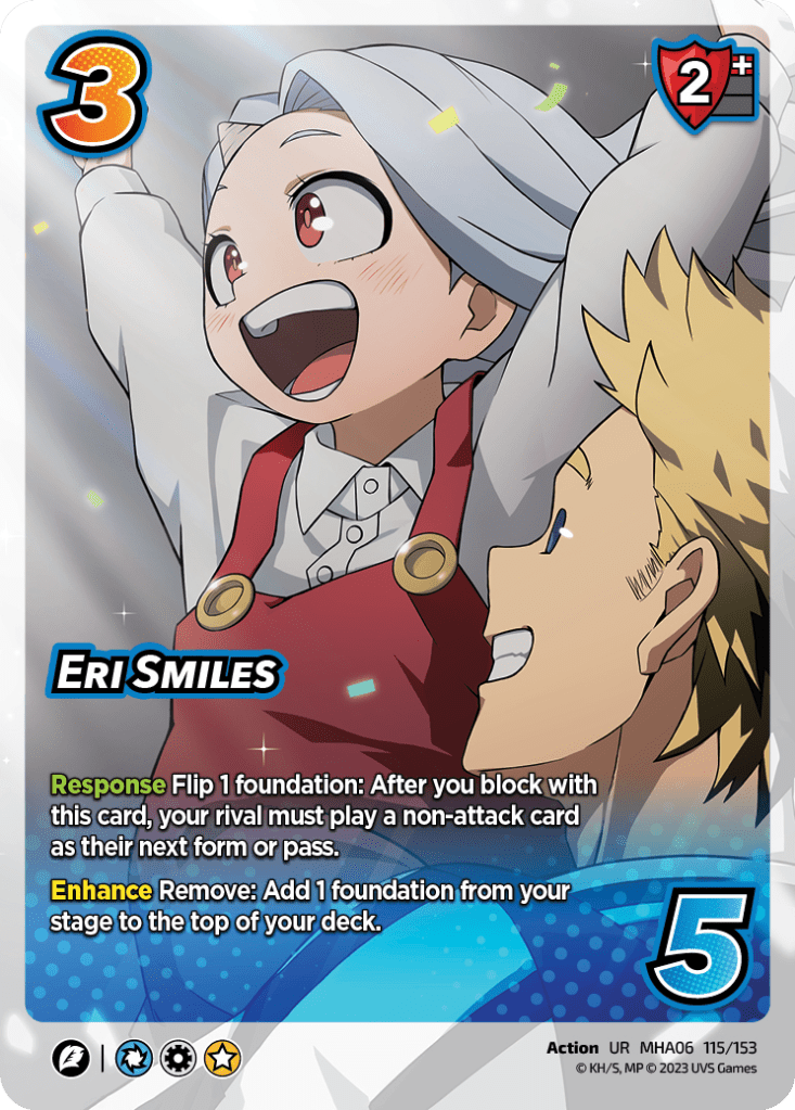 Eri Smiles shows off one of the most pivotal moments in the show and shows up with a similar impact on the table. Air & Good decks will enjoy their own Learning the Standards level defensive play, one of the best cards at stopping an attack turn and slowing down the best decks in the format right now, like Eraser-Death, Jiro, and Mirio.