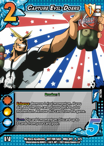 Capture Evil-Doers is a bit more complicated topic. The community conversation around the card has been running for a while, and while we were never fond of the NPE it created, especially against characters who put a premium on momentum, its usage (compared to other actions) and win rates never reached abnormal numbers. It mostly found a home in the Good Punch decks that were competitive, but not dominant. It also wasn’t fully pushing out the decks you’d expect it to, like Tamaki Amajiki. Then at the 3 Nationals events we saw a big uptick in usage. Many decks that in the past that were only siding the card, had shifted it to their main decks, and decks that were running it mainboard before now had even more copies. It also started to find broader adoption outside of the Good decks, ending up finding homes in Fire decks in particular. At Nationals, Capture tripled the next closest action (Barrier Shield) in usage and raised some alarms. We also knew with the release of Jet Burn, the card was about to find a few more homes. The Elephant, or Dragon to be more apt, in the room is Pro Hero Ryukyu. Ryukyu’s synergy with Capture Evil-Doers is incredible, just about always being able to pay the bill on the card pool clear ability. This leads to some very consistent kill turns in earlier turn windows that we are trying to reduce the number of games ending in. The impact in local level of play is particularly pronounced, as Ryukyu is deliberately a straight forward character meant to be welcoming to various levels of play experience. We know this strategy has some counterplay, especially at higher levels of play, but the play experience it creates when you don’t find those counters goes against our current goals for the game. Between the existing NPE the card creates for momentum driven characters, the large spike in play usage, and the gameplay loops the card is creating at various levels of play with the release of set 6, we’ve decided that it’s time to ban Capture Evil-Doers.With these changes, we will continue monitoring the post Jet Burn metagame for outliers. These cards have jumped off the page but we are watching very closely the early results coming in from all levels of play and the conversations about the game happening on our official social platforms.