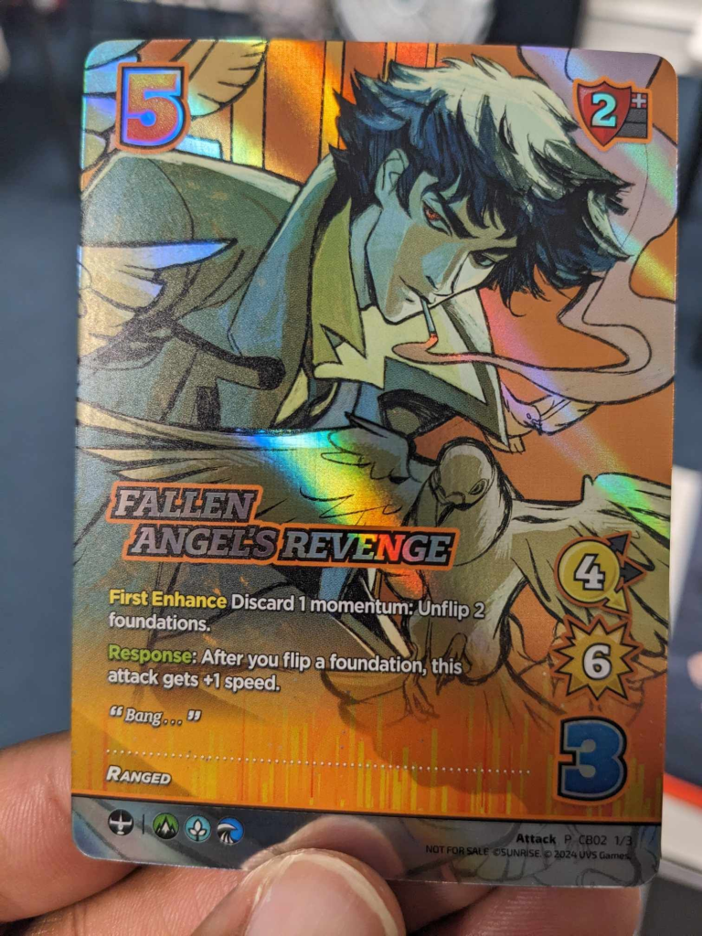 Ok, so where do you play first? Well, let’s go from the bottom up. You’re going to want to find a store near you that hosts locals on a weekly basis. Something UVS Games doesn’t brag about is they constantly try to reward players that come out to stores on a weekly basis. In the past year they’ve sent several surprise gifts to the player base including promos cards, Red Vines, and more. The most recent of them was a sweet Alt Art of Fallen Angel’s Revenge.