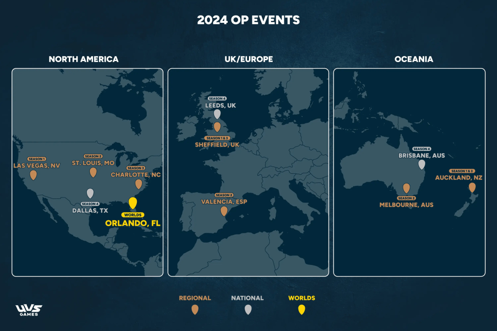 The In-Person Regionals have gone through many more changes than their online counterparts. First off, there are only 3 Major Regionals per region (NA, EU, & Oceania) this year. The 1st place winner of each of these 9 events will earn an invite to Worlds in Orlando, FL in February.