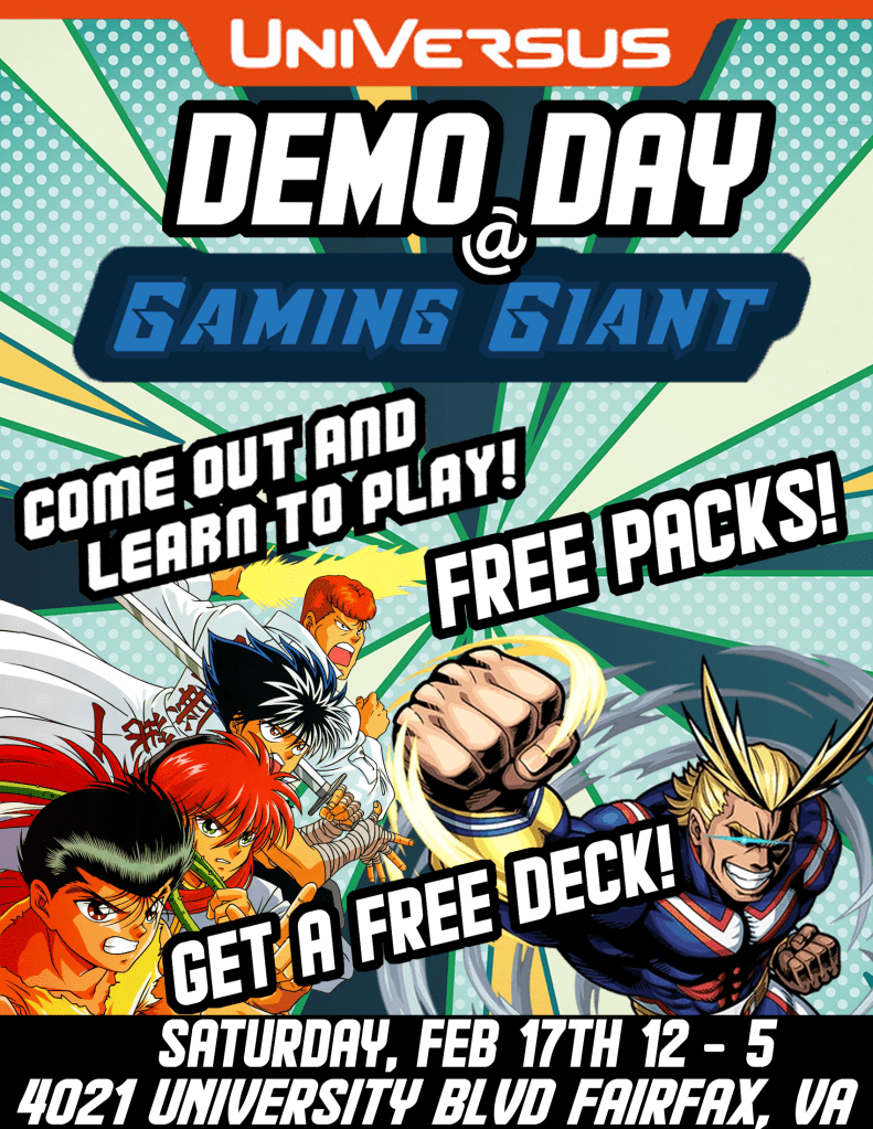 This Saturday (Feb 17th) at my local store (Gaming Giant in Fairfax, VA), we’ll be teaching new players how to play Universus. Anyone who completes a demo will get to roll for free packs (Guarenteed 2) and a chance to win a Regionals mat from 2023. Anyone who creates an account in-person on uvsgames.com will get a free deck crafted by yours truly!
