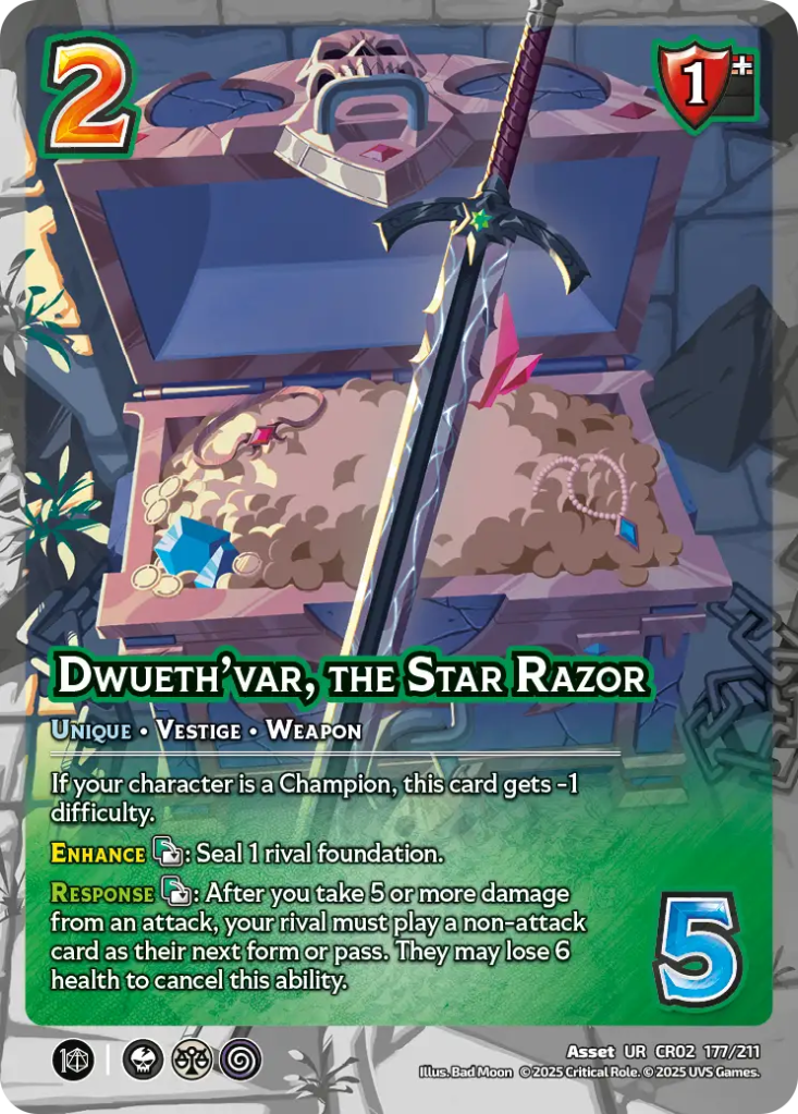 The meta around Actions is too murky to predict right now. There’s some cool combos and powerful effects coming in HoE. Is that enough to make Fenthras’ Enhance dangerous? Are there enough defensive Characters in the format to make the Response meaningful? We’ll just see, won’t we? +1 Speed is still strong. Respect that.