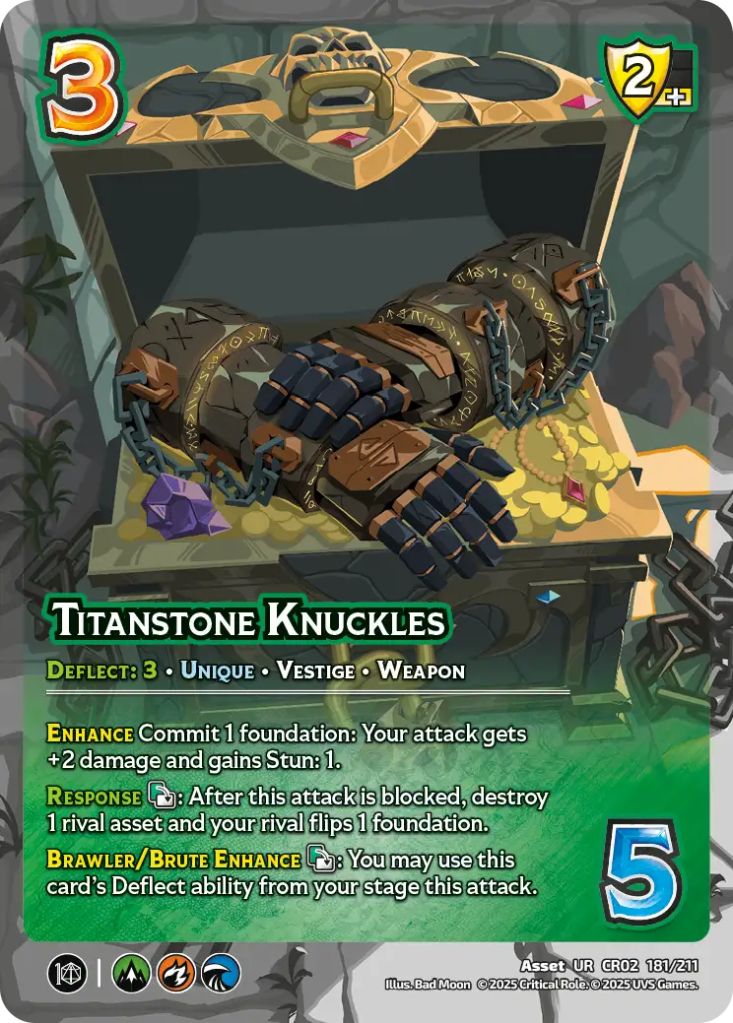 Titanstone Knuckles is my favorite card from the first round of Vestiges. The Knuckles are good on offense. Good for widdling down the rival stage. Good for Deflecting damage, so it can reward you for blocking or reduce the consequence for now blocking. GAS!